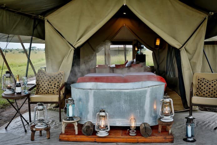 Llegamos al impactante campamento, colgado sobre el Cráter del Ngorongoro, por carretera después de un día de safari: la llegada va acompañada con olor a humo de madera. Tiendas privadas amplias y con absolutamente todas las comodidades de un buen hotel es sin lugar a dudas la experiencia moderna que más se parece a las primeras expediciones de los pioneros cazadores y aventureros que exploraban un Africa desconocida. Se palpa una sensación de autenticidad sin pretensiones, con enormes camas dobles hechas a mano y cubiertas de edredones de pluma de algodón blanco impecable para protegerse de las noches frías. Un gran baño montado en la parte de atrás, con duchas que son cubos suspendidos en el aire. Nuestro equipo se apresura a ofrecer a los huéspedes todo el confort de los safaris de antaño: una hoguera, símbolo potente de vida en la selva africana, que se dispara hacia arriba contra el rosa de la puesta de sol, es señal palpable de que el día largo de safari ha terminado y llega la hora de relajarse, agua caliente cuidadosamente transportada a cada tienda para una ducha merecida!, y finalmente, una cena formal, mesa larga montada con sumo detalle, cristal, porcelana e iluminada a la luz de las velas, y como no aderezada con historias de safari. El campamento se vuelve aún más espectacular por las noches por las docenas de candiles que lo iluminan y el tintineo del hielo que acompañará una copa mientras se pone el sol o simplemente se disfruta de los maravillosos cielos africanos en la oscuridad alrededor de la hoguera. La parafernalia antigua de safari junto con toques exóticos se palpa en cada rincón de este campamento. Con baños y duchas privados en cada tienda.